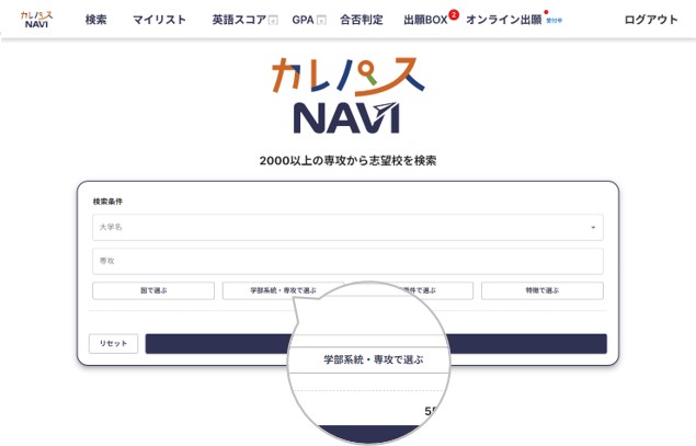 検索条件の「学部系統・専攻」をクリックして、「社会学・メディア学系」の『メディア学・コミュニケーション学』にチェックを付けて検索してみましょう
